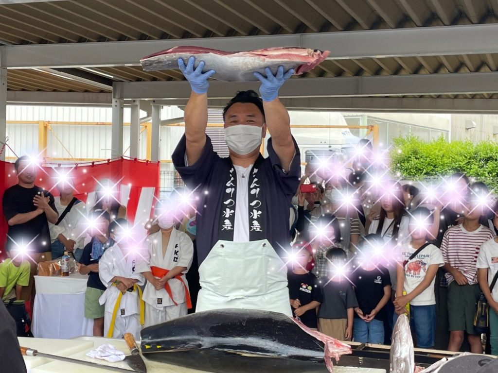 この日は、沖縄県産生きはだまぐ42㎏を準備させていただきました!解体師がまぐろを解体してる間に横の職人が ブロックから柵、柵からお刺身へと捌いていきますよ! 皆様最後まで観覧していただき、とても嬉しかったです。 解体師に話しかけてくださったり まぐろと記念写真を写したりと、とても楽しい解体ショーでした。 今回の解体ショーのように、大きなイベントや野外での解体ショーにも 対応しております。 まぐろ解体ショーをお考えの方は、是非さんりつ水産に ご相談ください!