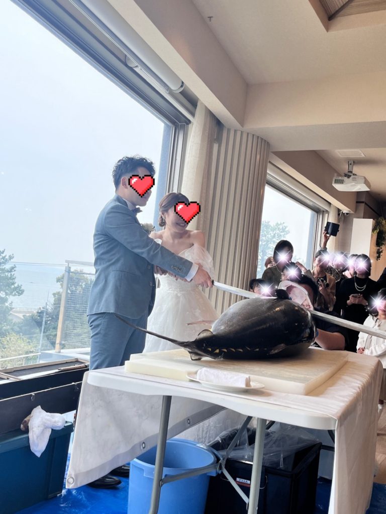 N様の御結婚披露宴に呼んでいただきました! 何度か打ち合わせをさせていただき、店舗のえびすまぐろの 解体ショーにも来ていただきました! 当日は、ご招待客の皆様にはサプライズだった為 ホテルスッタフの方と連携しバッチリサプライズ 大成功でしたよ( ◠‿◠ )↑↑↑サプライズまぐろ入場シー 釣りが趣味の、新郎様と新郎様ご友人様も大喜びでした。 ケーキ入刀ではなく、まぐろ入刀もしていただ来ました! 皆様、解体ショーに釘付けでしたよ! 職人がお刺身にきってます! 赤身 中トロ 大トロのお寿司にして提供させて いただきました! 提供準備しながら、感動し感動の涙を流してたのは ナイショ♪( ´▽`) 今回の様に、御結婚披露宴にも対応しております! サプライズも可能です! まぐろ解体ショーをお考えの新郎新婦様!プランナーの方 是非!さんりつ水産にご相談ください!