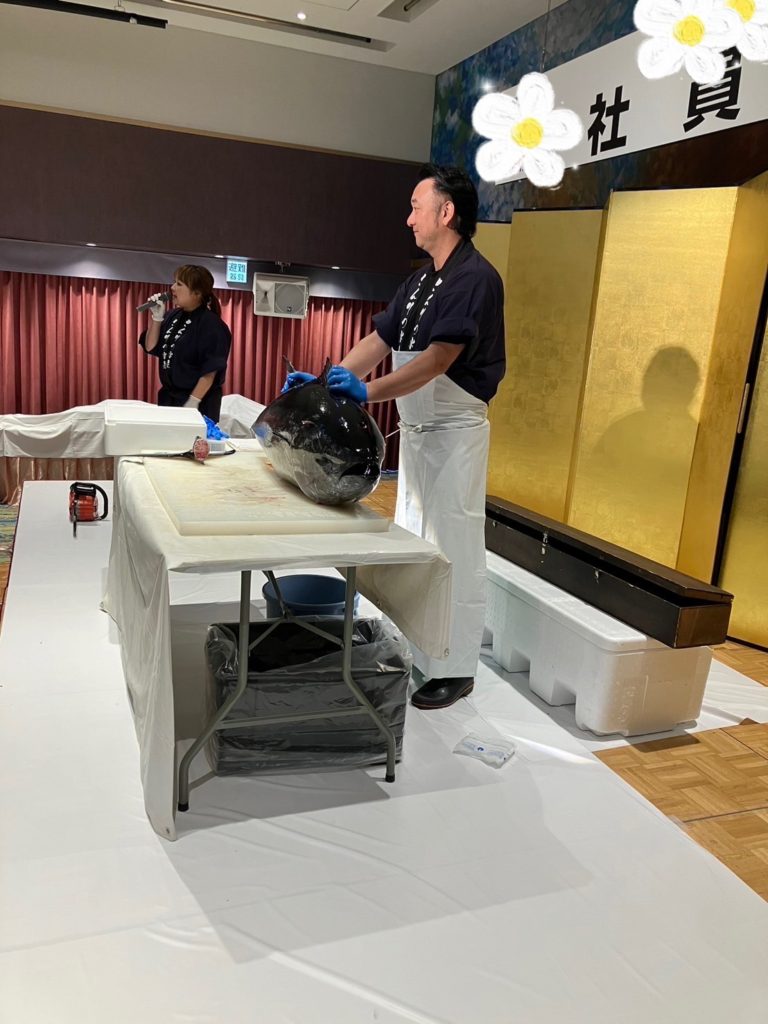 先日、M社様の社員懇親会に呼んでいただきました!今回は、まぐろを担いで入場をご希望いただきましたが、 なんと! 今回のまぐろ!54キロ!!! 我が社長でも担ぐのが困難( ; ; ) でも、なんとか叶えたい!と思い! まぐろが入った大きな箱ごと担いで入場 させていただきました(^ω^) 会場内を練り歩き٩( 'ω' )و 無事!まぐろが舞台に届けられました! 今回は、お寿司三種盛り(今回の本まぐろは 脂乗りが良く贅沢トロ盛りになりました) まぐろ丼はセルフでしたので盛り放題!! 皆様とても喜んでいただき、あっという間に 54キロのまぐろがなくなりました!! 今回の様に、社内イベントなどにも対応しております! まぐろ解体ショーをお考えの方! 是非!さんりつ水産にご相談ください!!