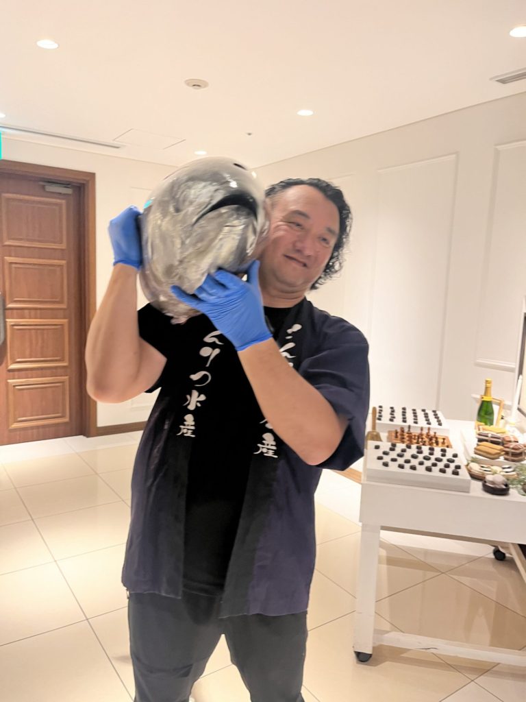 みなさんこんにちは! 先日は、K様のご結婚披露宴に呼んでいただけました! K様にはメールでの問い合わせ後に、えびすまぐろでの 月一の解体ショーに来ていただき、えびすまぐろの 解体ショーとは少し違いますがイメージしていただきました。今回も!!勿論!!!! サプラズ!!でしたので 式場スタッフさんと連携をっとり バッチリ!サプライズできましたよ! 披露宴では まぐろ入刀にファーストバイト等楽しんでいただきました。 今回は、生本まぐろ34キロを準備させていただき お寿司にてご提供させていただきました。 今回も沢山の幸せのお裾分けをしていただき 私まで幸せな気分になりました! 勿論! 今回も、感動して涙腺崩壊しました! 結婚式などにも対応しております! 新郎新婦様!プランナー様! いつでも、さんりつ水産にご相談ください!