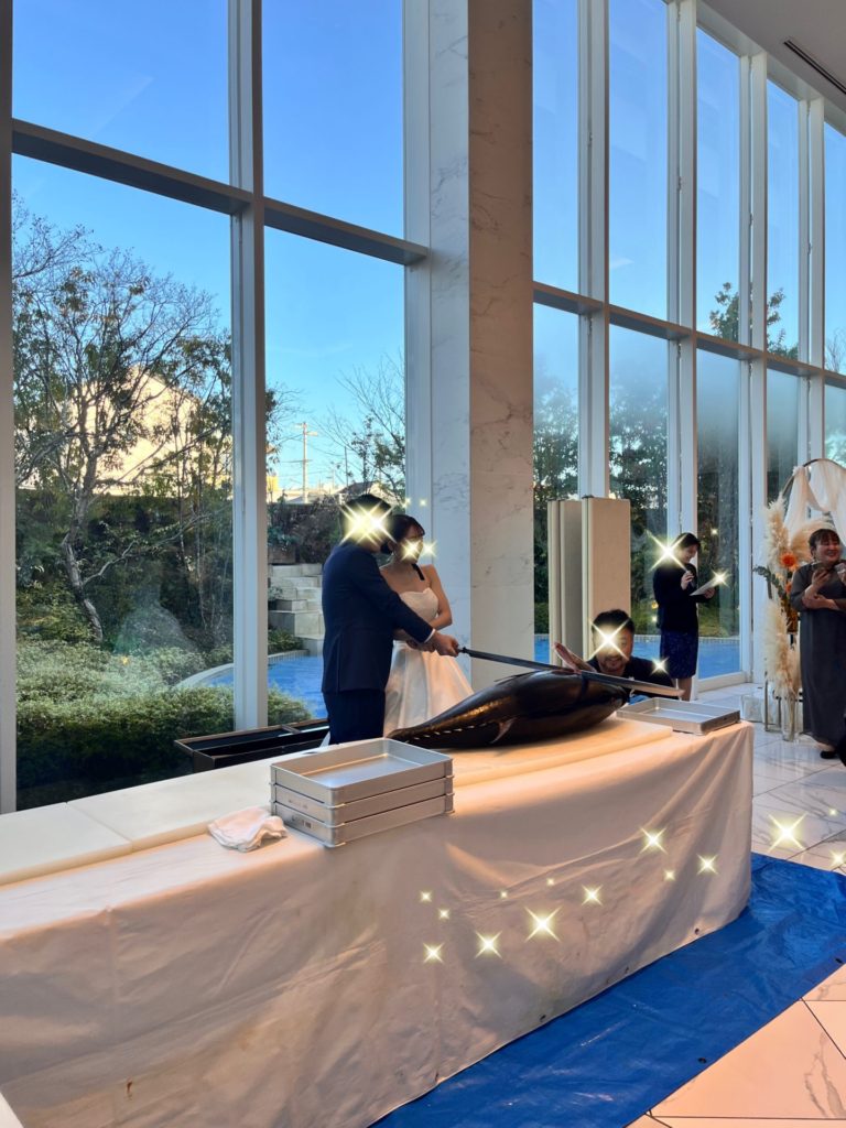 こんにちは! 先日は、S様の御結婚披露宴に呼んでいただけました。 勿論!御招待客の皆様にはサプライズでしたので、 会場スタッフの方々と力を合わせてサプライズ大成功 でした!まぐろ入刀も大成功! 大トロでの、ファーストバイトも大変喜んで いただけました。 大トロ中トロ当てクイズも大変盛り上がり 準備しながら私も楽しんでしましたした。 今回の様に、御結婚披露宴での解体ショーも 大歓迎です。 まぐろ解体ショーをお考えの新郎新婦様!プランナー様! 是非!さんりつ水産にご相談ください。