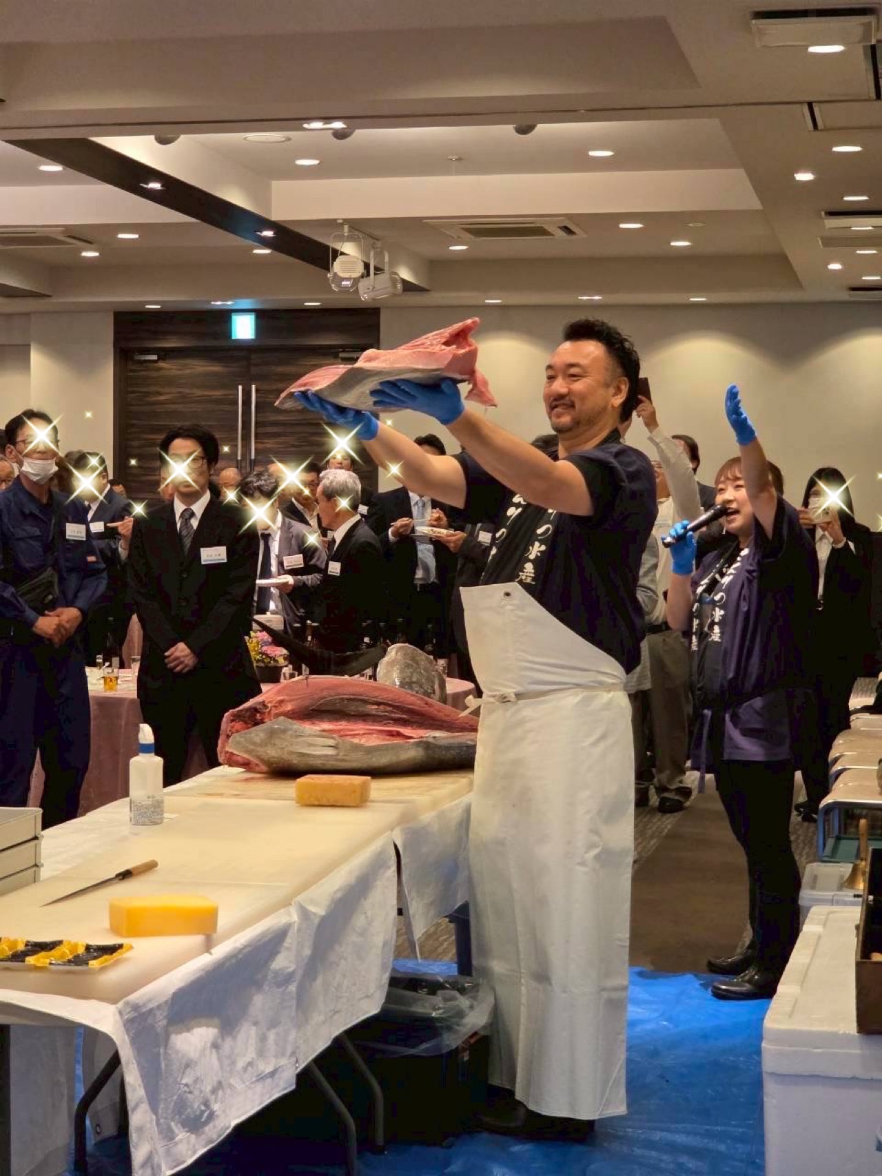 皆様こんにちは!先日の企業様の解体ショーは なんと!海外の方がほとんどの解体ショーでした。 残念ながら英語が話せない私、、、しかし、お客様が通訳を付けてくださり事前打ち合わせも しっかりしたお陰で、非常に盛り上がりました! 今回は、長崎県産生本まぐろ32キロ お寿司にてご提供! 海外の方なので、食べれるかな?と思ってましたが しっかり、トロや赤身をおかわりしてくださいました。 リアクションも海外でまぐろ解体ショーを開催しているかのような 雰囲気ですごく楽しく解体ショーができました。